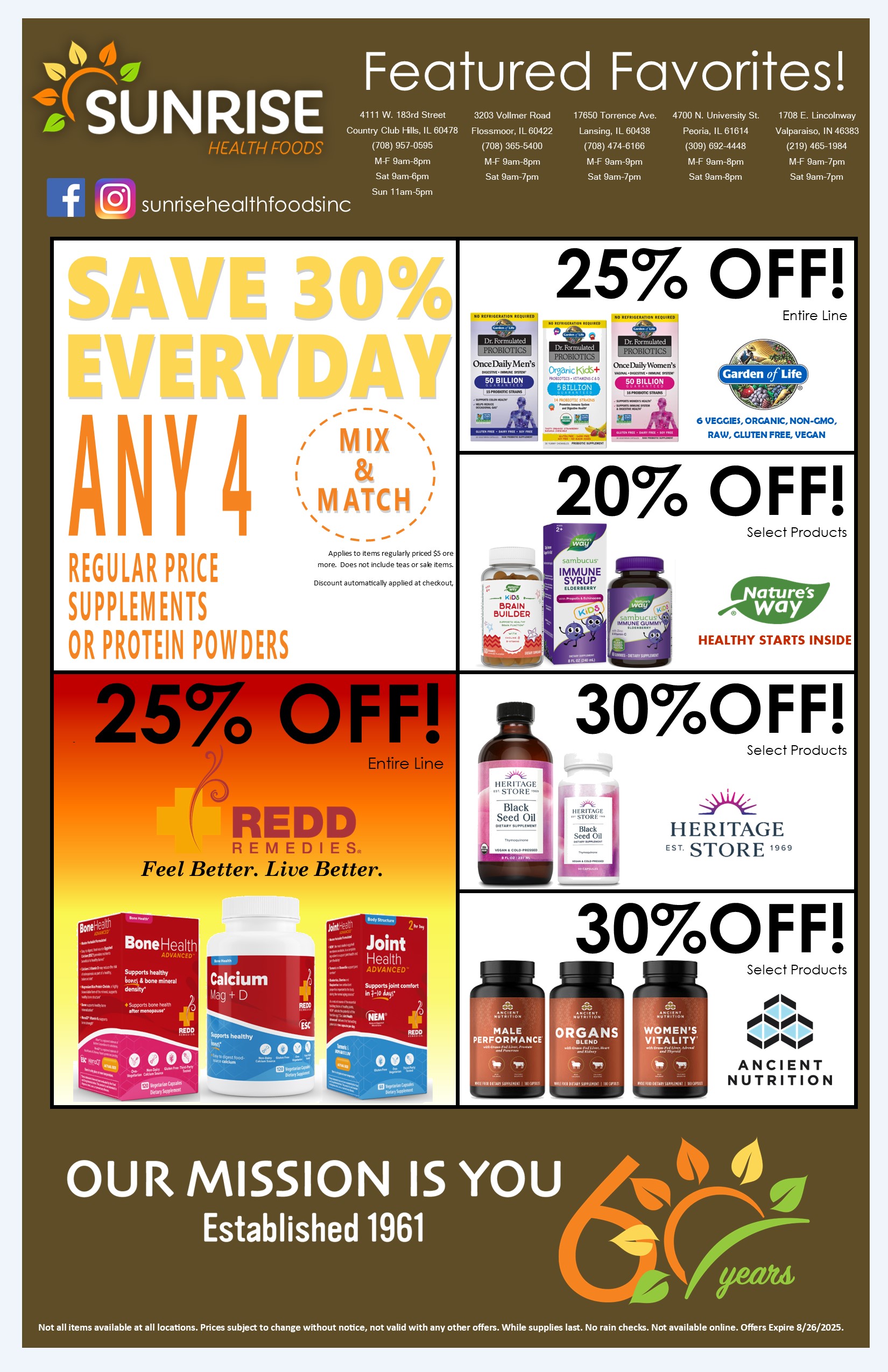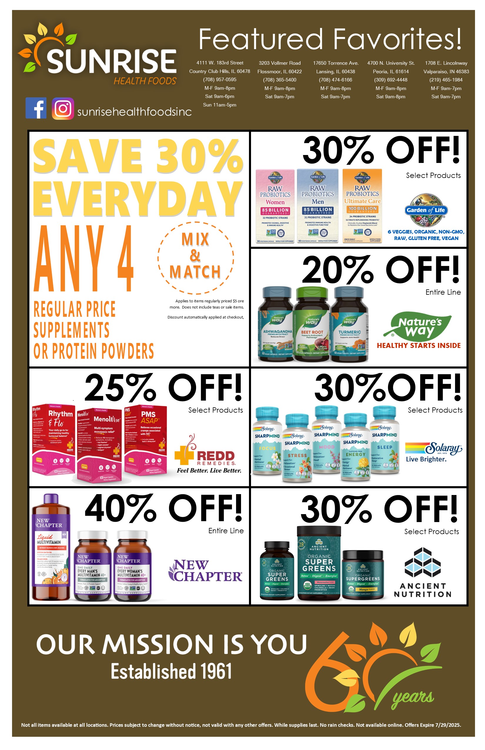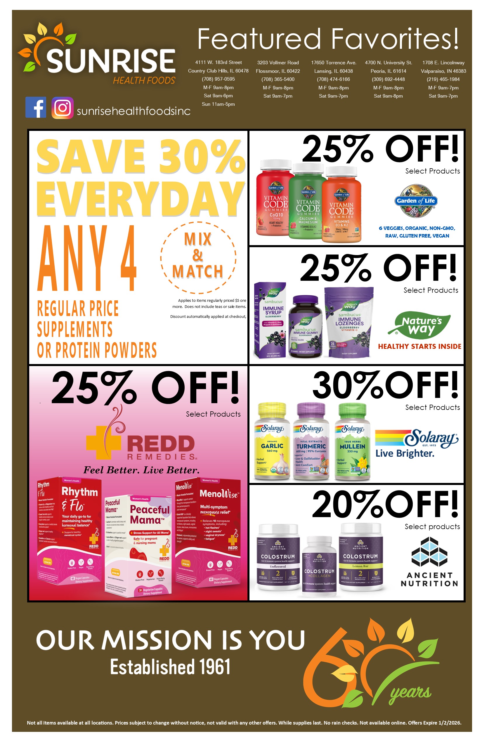 Our DECEMBER 2025 Sunrise Health Foods Featured Favorites & Independent Choice Flyer are now available. Prices and varieties may vary by location. Some items or varieties may not be available in all stores.