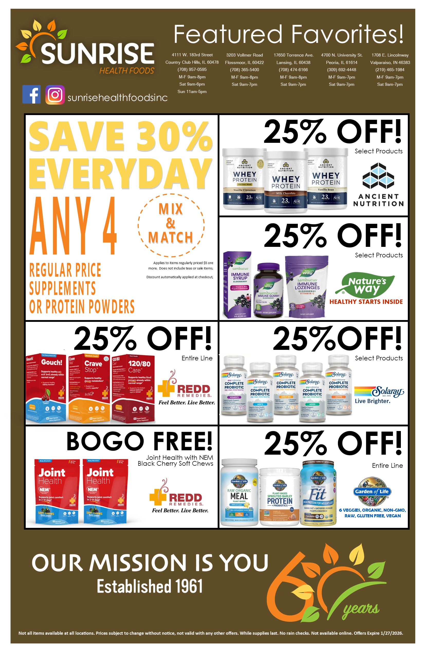 Our JANUARY 2026 Sunrise Health Foods Featured Favorites & Independent Choice Flyer are now available. Prices and varieties may vary by location. Some items or varieties may not be available in all stores.