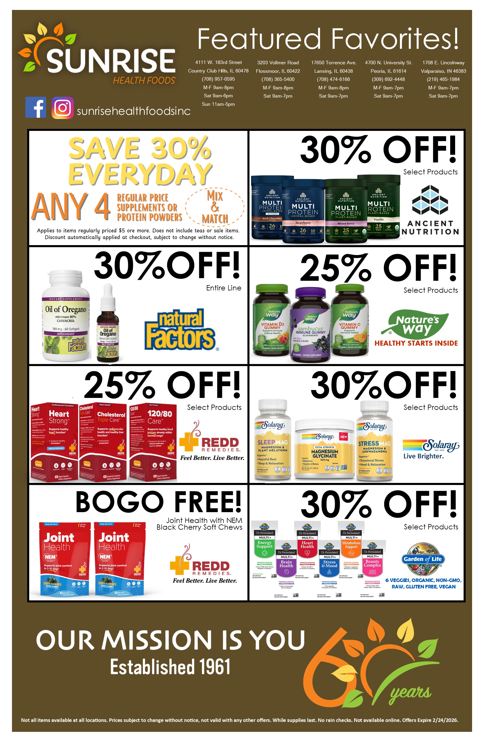 Our FEBRUARY 2026 Sunrise Health Foods Featured Favorites & Independent Choice Flyer are now available. Prices and varieties may vary by location. Some items or varieties may not be available in all stores.